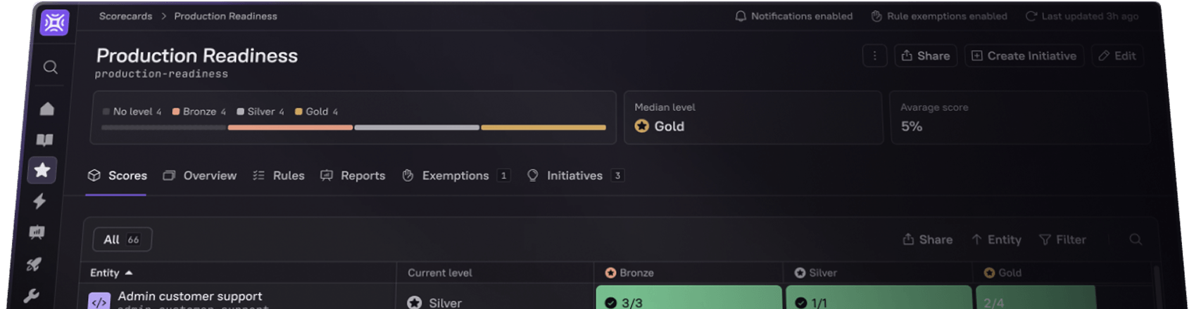 Every service is continuously scored against your standards, gaps are surfaced automatically, and teams fix issues before they become incidents.